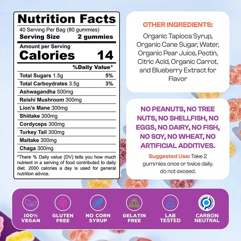 Each gummy contains a blend of Chaga, Maitake, Turkey Tail, Shiitake, Reishi, Cordyceps, Lion’s Mane, and KSM-66 Ashwagandha for a powerhouse of benefits.
